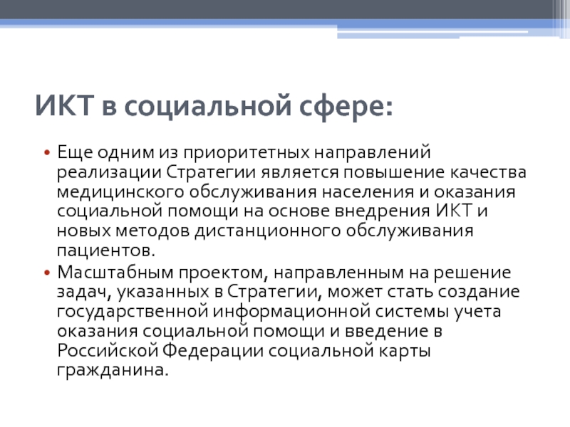 Масштабным проектом, направленным на решение задач, указанных в Стратегии, может стать создание государственной информационной системы учета оказания социальной помощи и введение в Российской Федерации социальной карты гражданина.