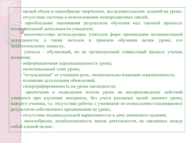 Слайд 13- малый объем и однообразие творческих, исследовательских заданий на уроке;