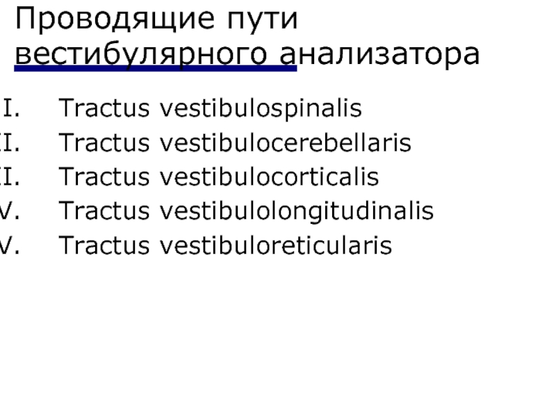 Проводящие пути вестибулярного анализатораTractus vestibulospinalisTractus vestibulocerebellarisTractus vestibulocorticalisTractus vestibulolongitudinalisTractus vestibuloreticularis