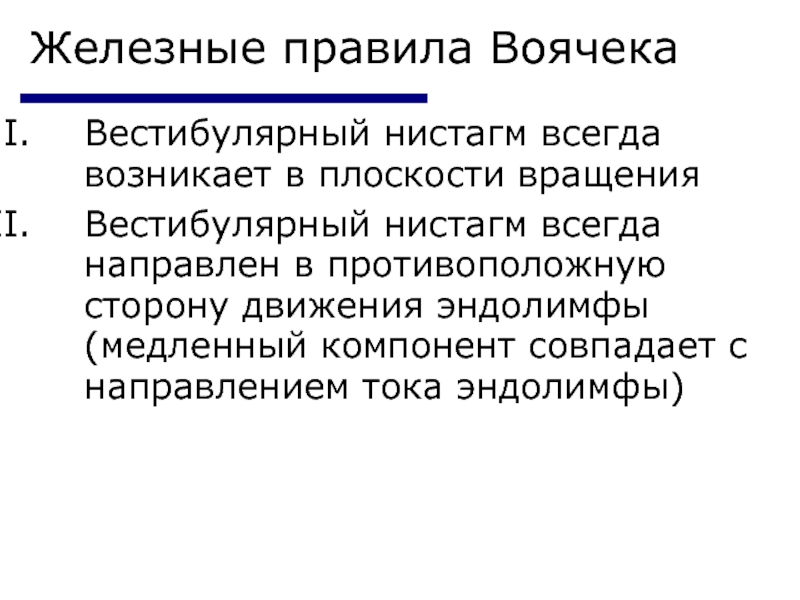Железные правила ВоячекаВестибулярный нистагм всегда возникает в плоскости вращенияВестибулярный нистагм всегда направлен в противоположную сторону движения эндолимфы