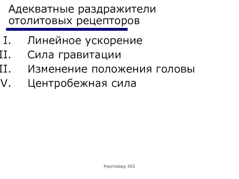 Psychology 355Адекватные раздражители отолитовых рецепторовЛинейное ускорениеСила гравитацииИзменение положения головыЦентробежная сила