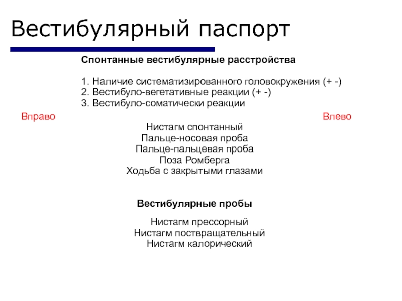 Вестибулярный паспорт Спонтанные вестибулярные расстройства 1. Наличие систематизированного головокружения (+ -)2. Вестибуло-вегетативные реакции (+ -)3. Вестибуло-соматически реакцииВправо