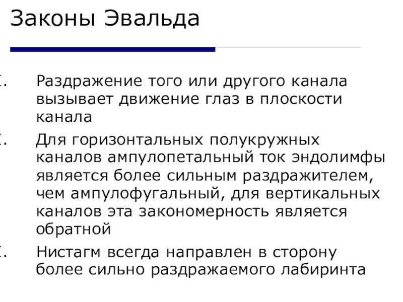 сильным раздражителем, чем ампулофугальный, для вертикальных каналов эта закономерность является обратнойНистагм всегда направлен в сторону более сильно раздражаемого лабиринта