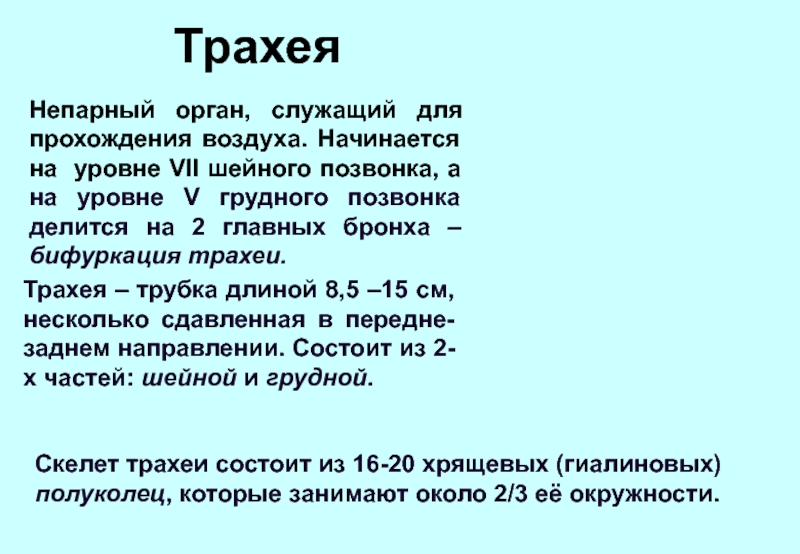 Трахея – трубка длиной 8,5 –15 см, несколько сдавленная в передне-заднем направлении. Состоит из 2-х частей: шейной и грудной.