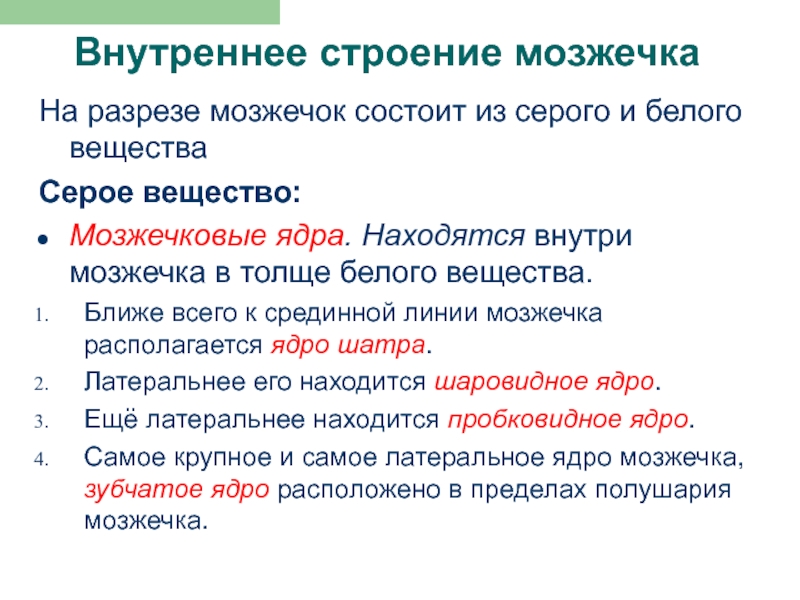 Мозжечковые ядра. Находятся внутри мозжечка в толще белого вещества.