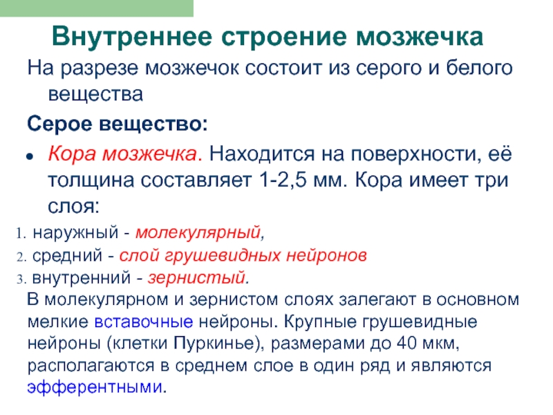 В молекулярном и зернистом слоях залегают в основном мелкие вставочные нейроны. Крупные грушевидные нейроны (клетки Пуркинье), размерами до 40 мкм, располагаются в среднем слое в один ряд и являются эфферентными.