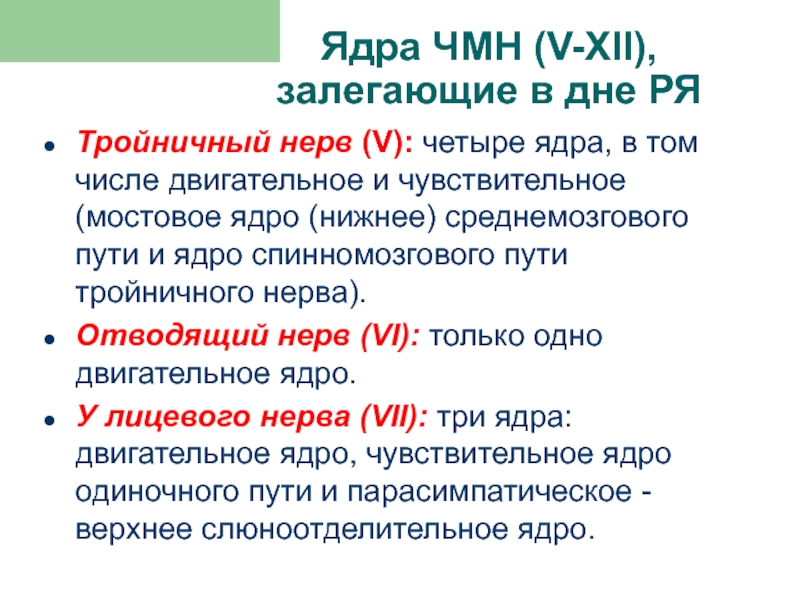 У лицевого нерва (VII): три ядра: двигательное ядро, чувствительное ядро одиночного пути и парасимпатическое - верхнее слюноотделительное ядро.