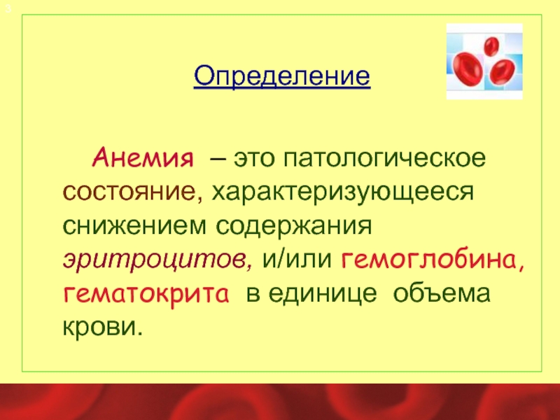 характеризующееся снижением содержания эритроцитов, и/или гемоглобина, гематокрита в единице объема