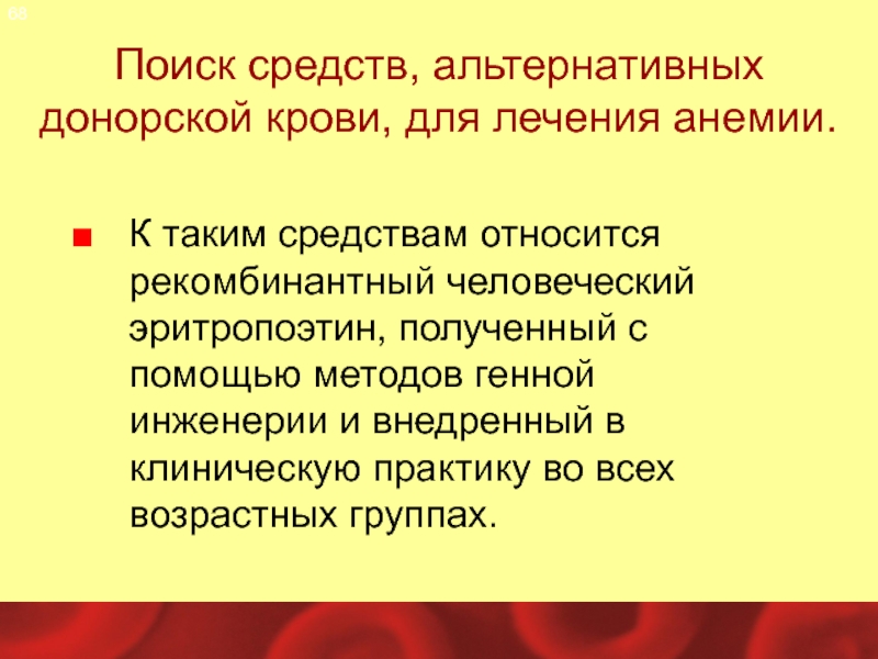 Слайд 68Поиск средств, альтернативных донорской крови, для лечения анемии.