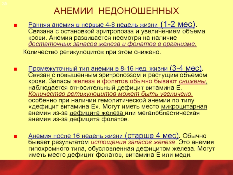 рождении и ГВ менее 30 недель тяжелая анемия составляет 80-90 %.