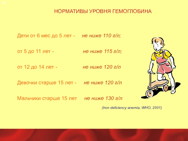 Слайд 74НОРМАТИВЫ УРОВНЯ ГЕМОГЛОБИНА