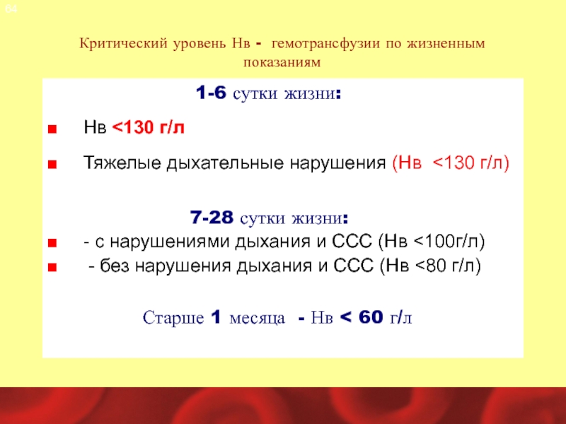 Слайд 64Критический уровень Нв - гемотрансфузии по жизненным показаниям