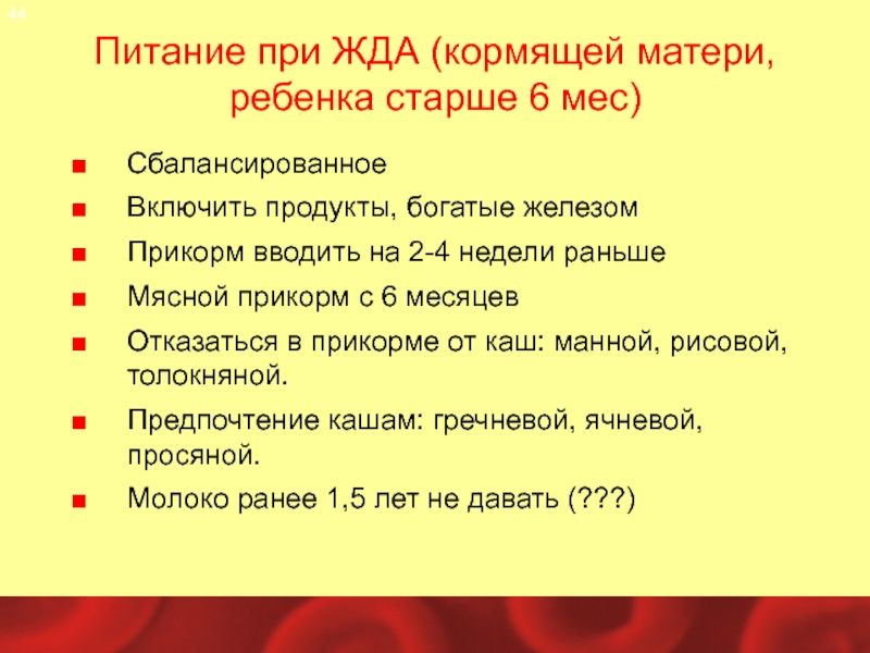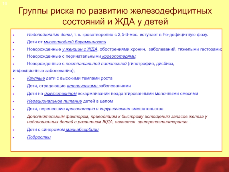 Слайд 16Группы риска по развитию железодефицитных состояний и ЖДА у детей