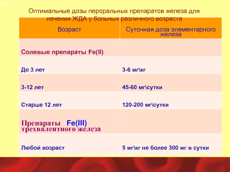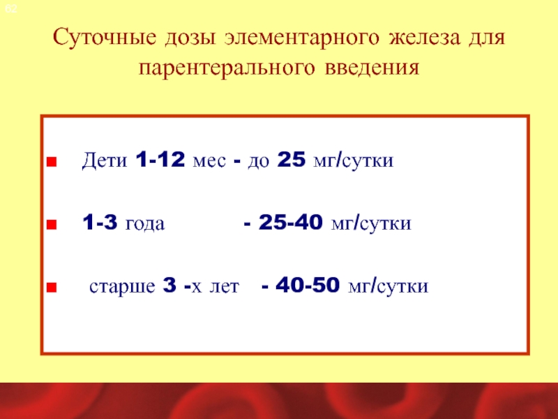 Слайд 62Суточные дозы элементарного железа для парентерального введения