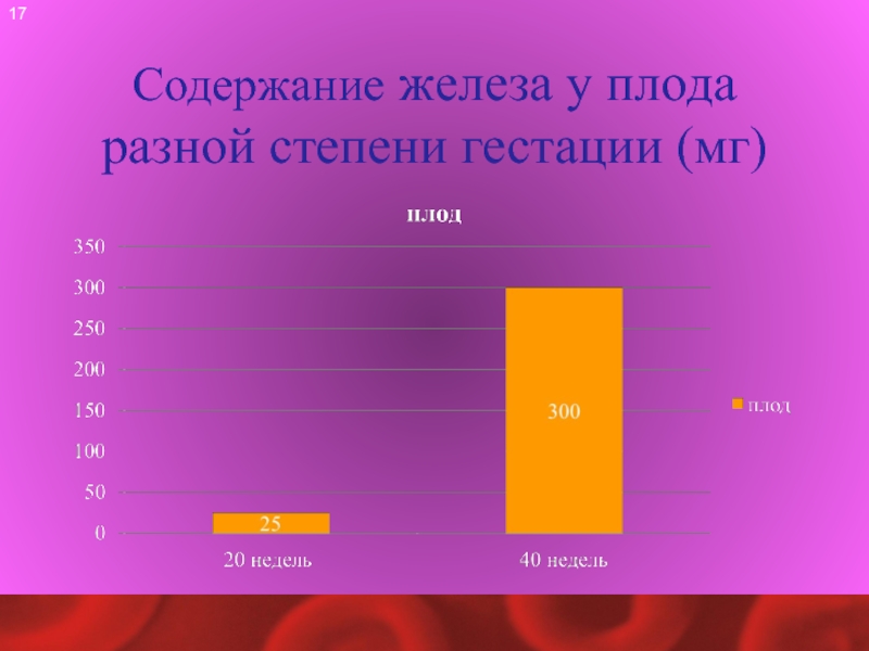Слайд 17Содержание железа у плода разной степени гестации (мг)