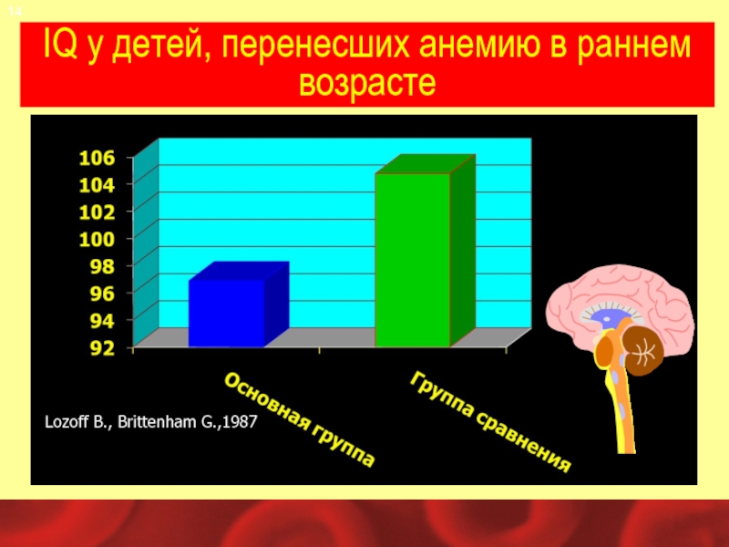 Слайд 14IQ у детей, перенесших анемию в раннем возрасте
