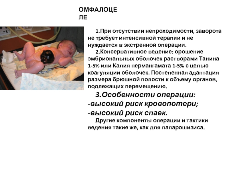 2.Консервативное ведение: орошение эмбриональных оболочек растворами Танина 1-5% или Калия пермангамата 1-5% с целью коагуляции оболочек. Постепенная адаптация размера брюшной полости к объему органов, подлежащих перемещению.