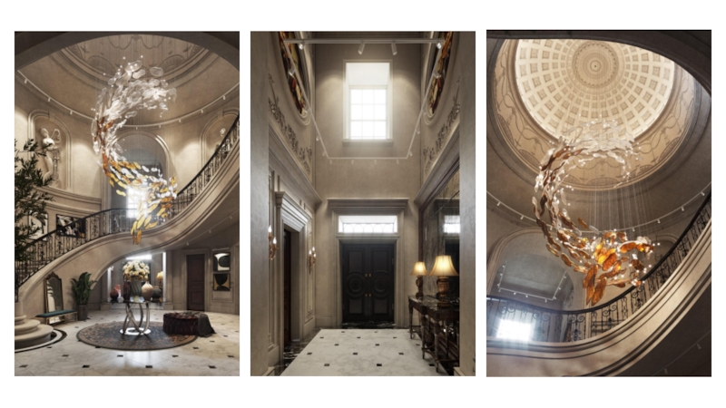 Чаще всего потолок просто побелен или окрашен светлой краской. Чтобы придать ему законченный вид, по периметру его украшают лепными карнизами (отголосок классики и барокко). Карнизы окрашивают в тон стен или потолка, иногда делают золоченными.