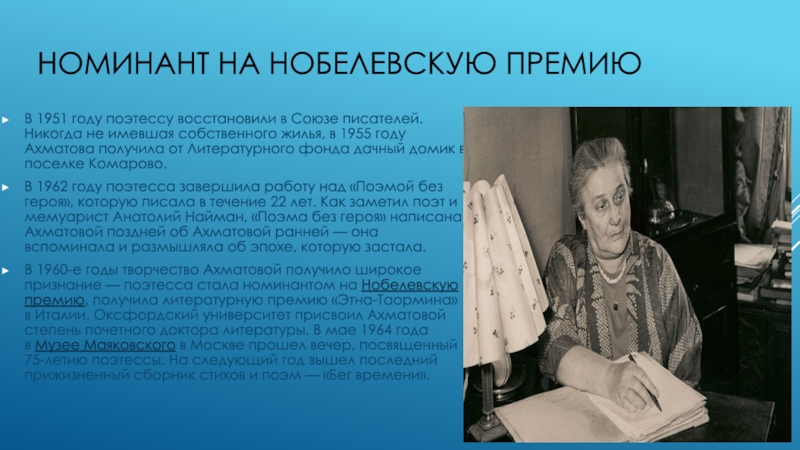 Год потрясений и утрат стал плодотворным для поэтического творчества Ахматовой. В апреле 1921 года вышел сборник стихов «Подорожник», а в октябре — книга «Anno Domini MCMXXI» (в переводе с латинского — «В лето господне 1921-го»).