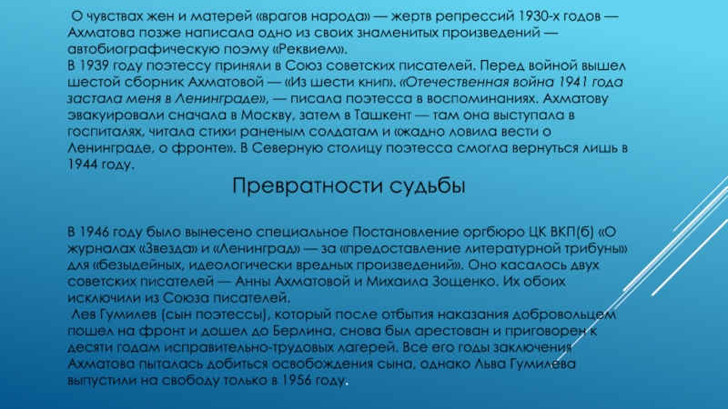 Брак Ахматовой и Гумилева распался в августе 1918 года. Поэтесса вышла замуж за Владимира Шилейко — востоковеда и поэта, специалиста по Древнему Египту. В 1921 году Гумилева арестовали, а затем расстреляли — поэта обвинили в причастности к контрреволюционному заговору. Ахматова писала в дневнике: «Блок, Гумилев, Хлебников умерли почти одновременно. Ремизов, Цветаева и Ходасевич уехали за границу, там же были Шаляпин, Михаил Чехов и половина балета».