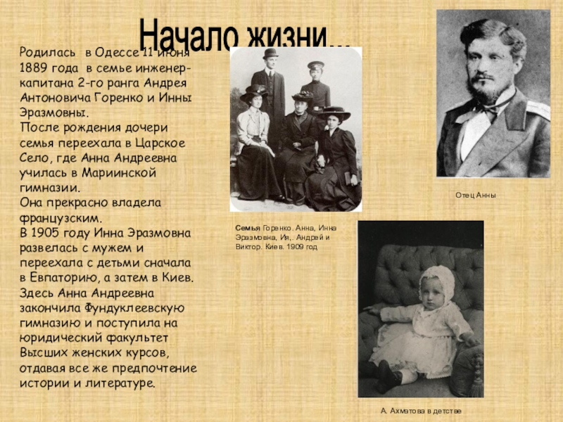 рождения дочери семья переехала в Царское Село, где Анна Андреевна училась в Мариинской гимназии. Она прекрасно владела французским.