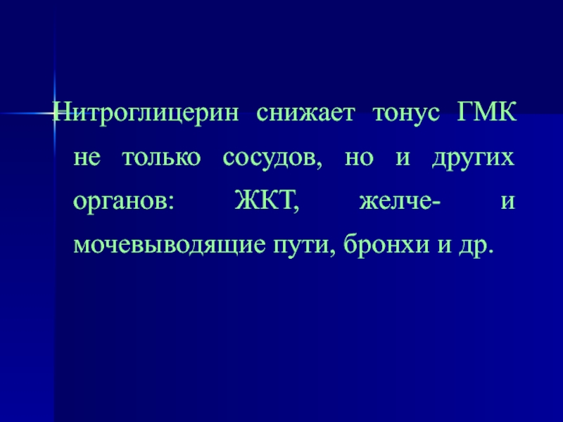 Слайд 17Нитроглицерин снижает тонус ГМК не только сосудов, но и других