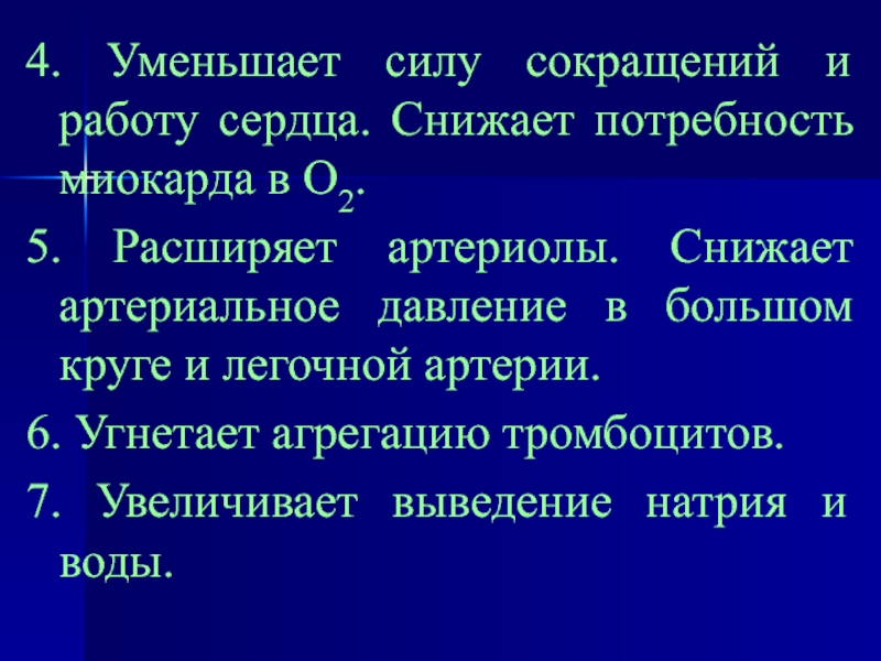 Слайд 354. Уменьшает силу сокращений и работу сердца. Снижает потребность миокарда