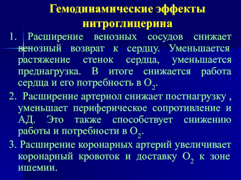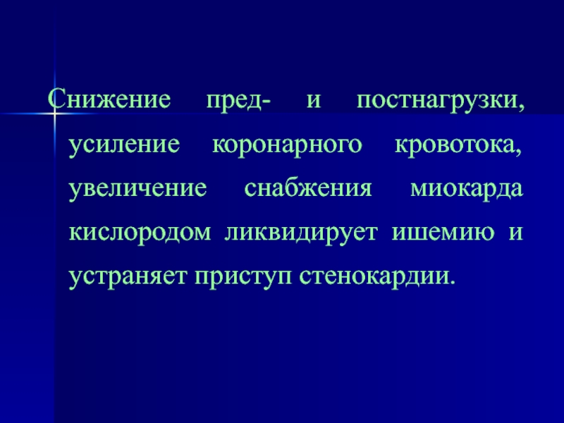 Слайд 16Снижение пред- и постнагрузки, усиление коронарного кровотока, увеличение снабжения миокарда