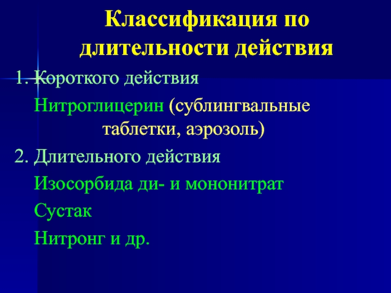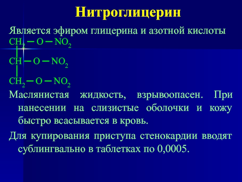 Слайд 18Спазмолитическое действие нитроглицерина развивается через 1-2 минуты после сублингвального применения