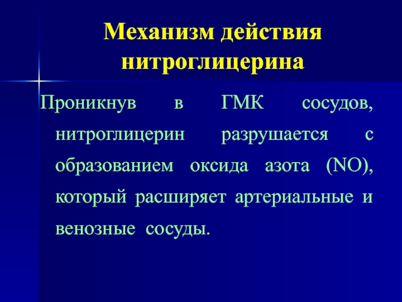 Проникнув в ГМК сосудов, нитроглицерин разрушается с образованием