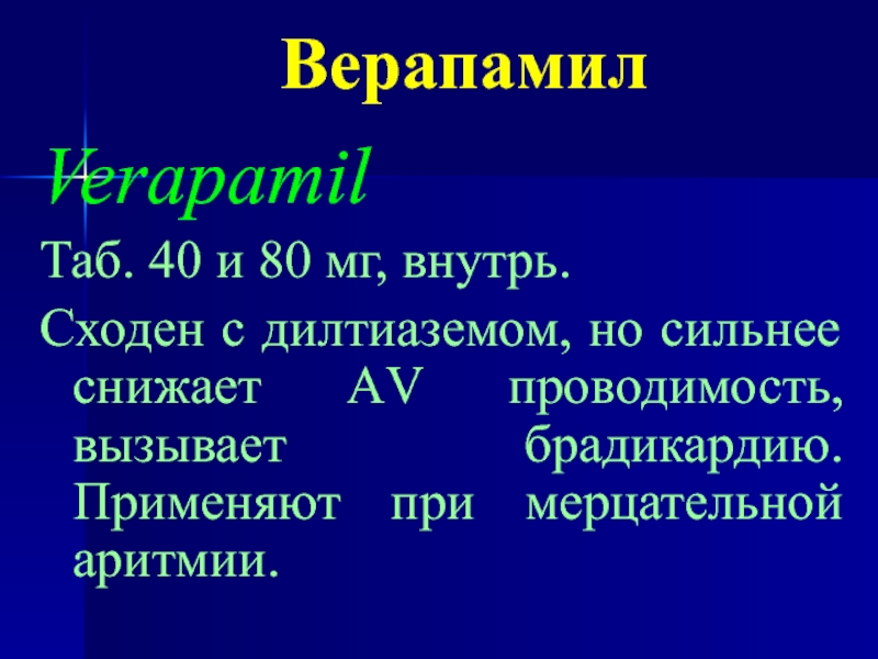 Слайд 40Блокирует Са++ каналы. Уменьшает вхождение Са++ в кардиомиоциты и ГМК.