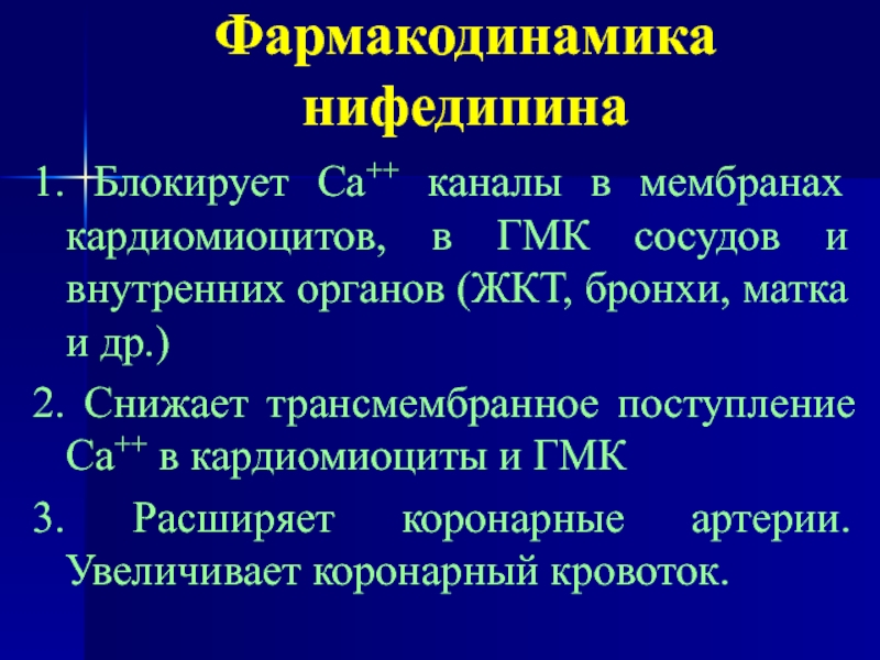 1. Блокирует Са++ каналы в мембранах кардиомиоцитов, в ГМК сосудов