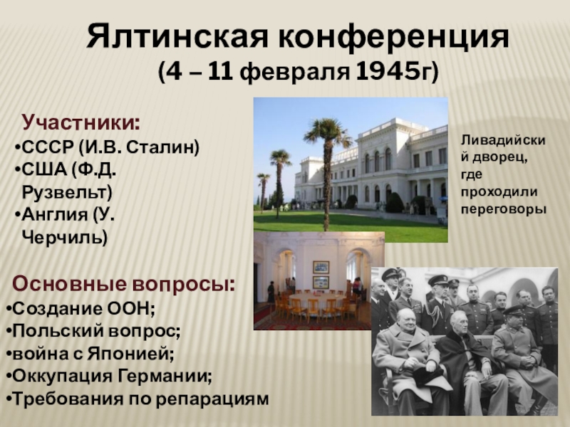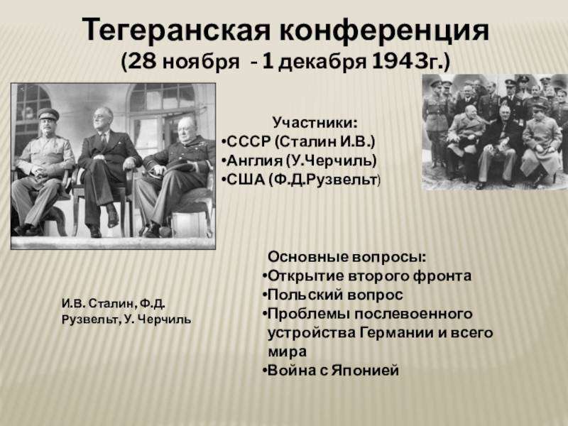 И.В. Сталин, Ф.Д.Рузвельт, У. Черчиль