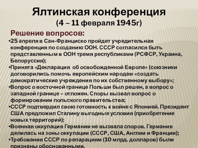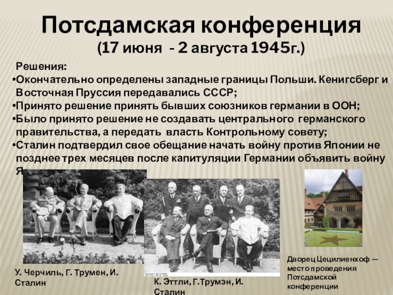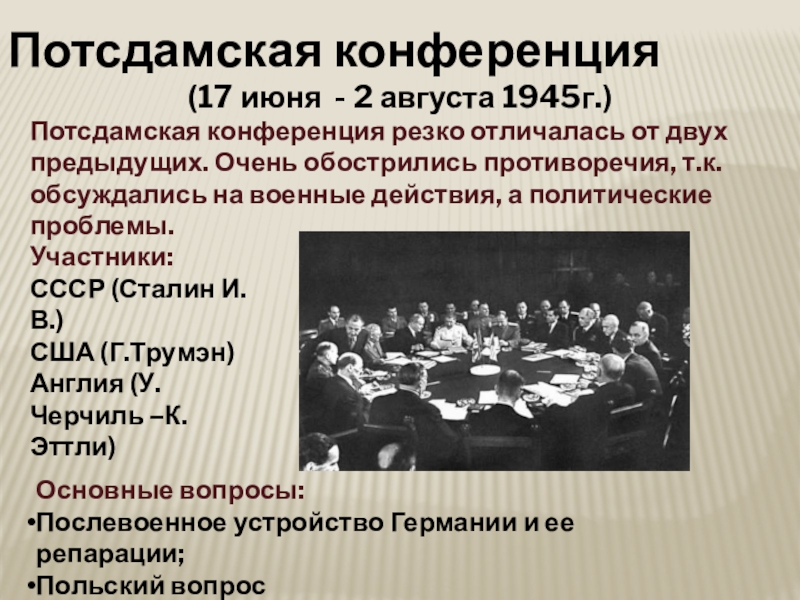 Потсдамская конференция резко отличалась от двух предыдущих. Очень обострились противоречия, т.к. обсуждались на военные действия, а политические проблемы.
