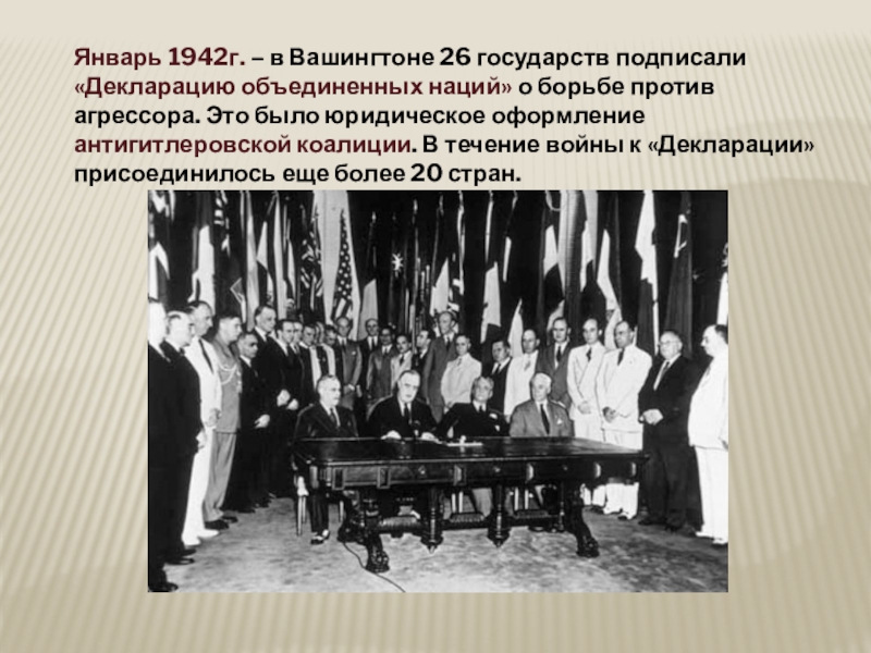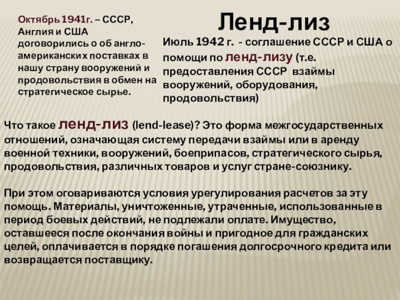 Октябрь 1941г. – СССР, Англия и США договорились о об англо-американских поставках в нашу страну вооружений и продовольствия в обмен на стратегическое сырье.