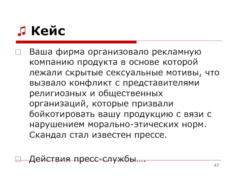 общественных организаций, которые призвали бойкотировать вашу продукцию с вязи с нарушением морально-этических норм. Скандал стал известен прессе.