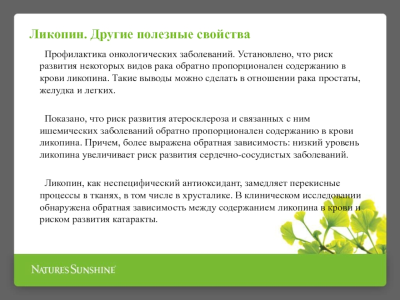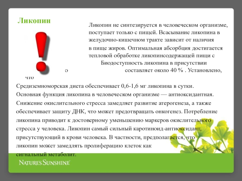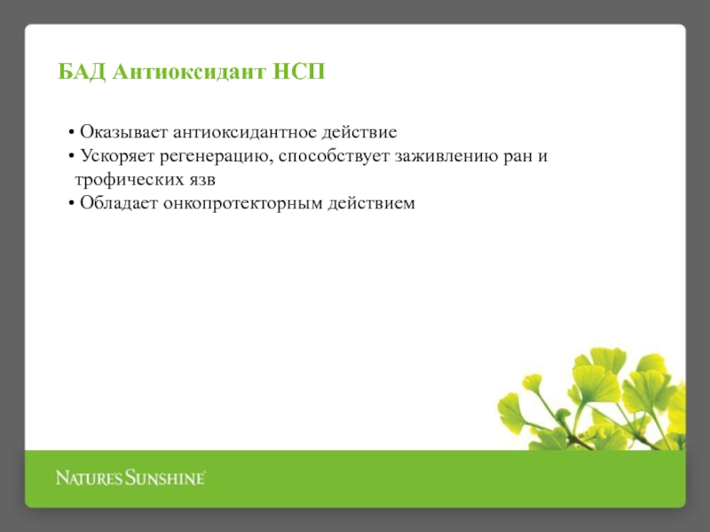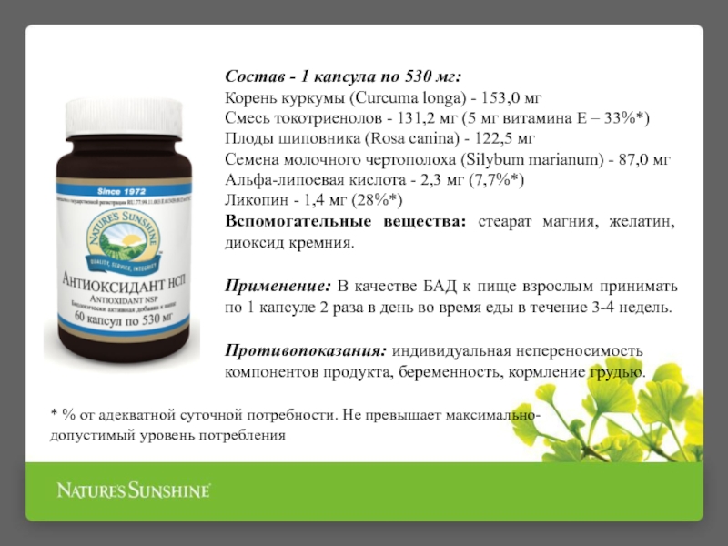 также под влиянием внешних факторов (загрязнения окружающей среды, курение, радиация). Помогают организму противостоять свободным радикалам антиоксиданты, способные нейтрализовать их активность. Большинство людей не получают достаточного количества антиоксидантов с пищей, поэтому им нужно принимать БАД – антиоксиданты.Антиоксидант НСП обеспечивает антиоксидантную защиту организма и, кроме известных антиоксидантов: α-липоевой кислоты, ликопина и токотриенолов, содержит травы, обладающих антиоксидантным и противовоспалительным действием: куркуму, шиповник и молочный чертополох.