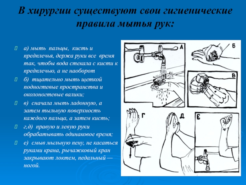 Слайд 44В хирургии существуют свои гигиенические правила мытья рук: