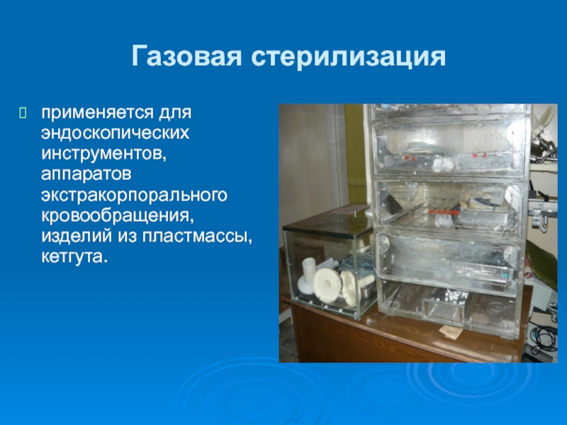 Газовая стерилизация позволяет стерилизовать сложные аппараты и приборы, не разбирая их на части (аппарат искусственного кровообращения, наркозные аппараты, аппараты искусственной вентиляции легких и т.п.).