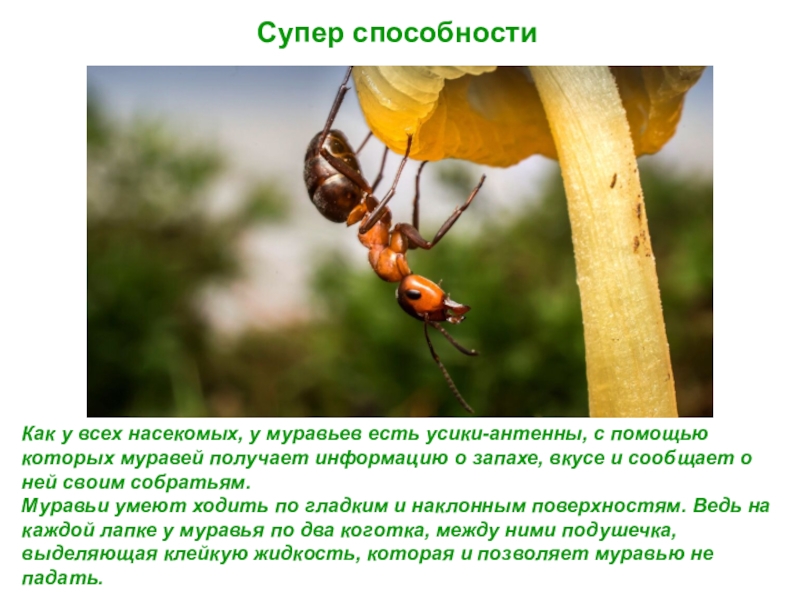 Муравьи умеют ходить по гладким и наклонным поверхностям. Ведь на каждой лапке у муравья по два коготка, между ними подушечка, выделяющая клейкую жидкость, которая и позволяет муравью не падать.