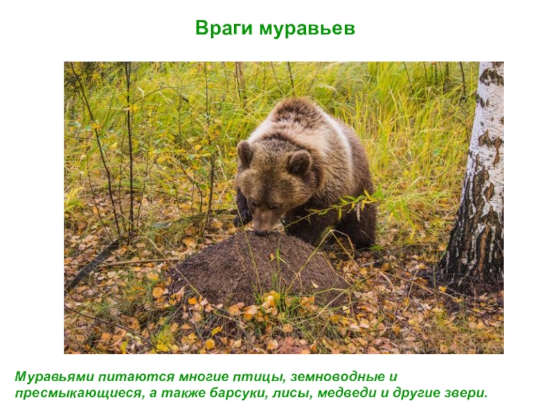 Муравьями питаются многие птицы, земноводные и пресмыкающиеся, а также