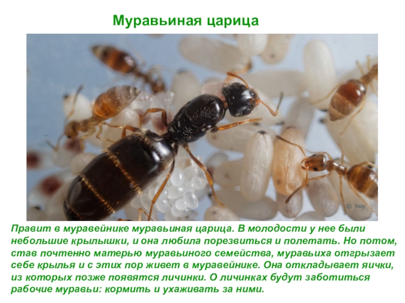потом, став почтенно матерью муравьиного семейства, муравьиха отгрызает себе крылья и с этих пор живет в муравейнике. Она откладывает яички, из которых позже появятся личинки. О личинках будут заботиться рабочие муравьи: кормить и ухаживать за ними.