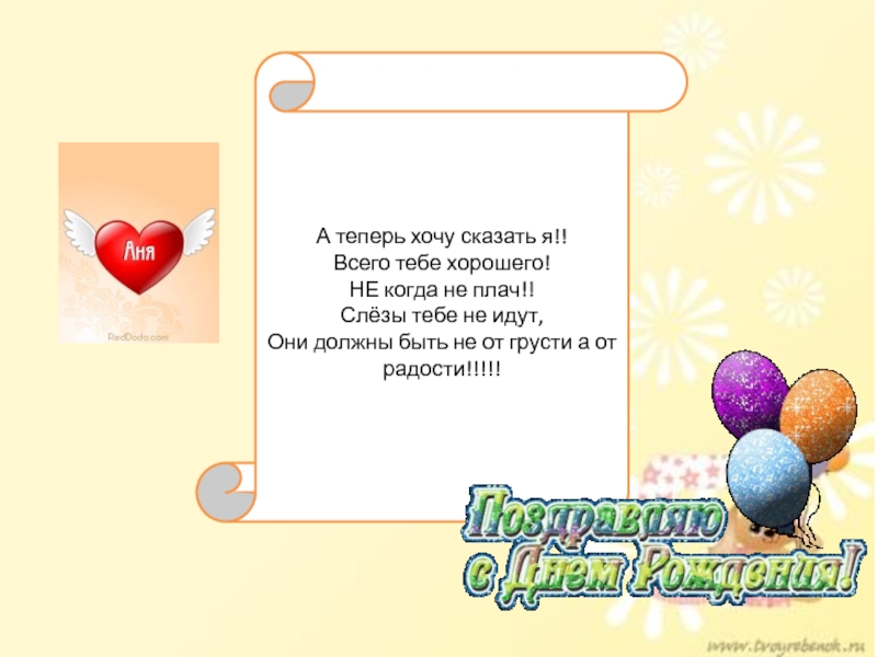 А теперь хочу сказать я!!Всего тебе хорошего!НЕ когда не плач!! Слёзы тебе не идут,Они должны быть не