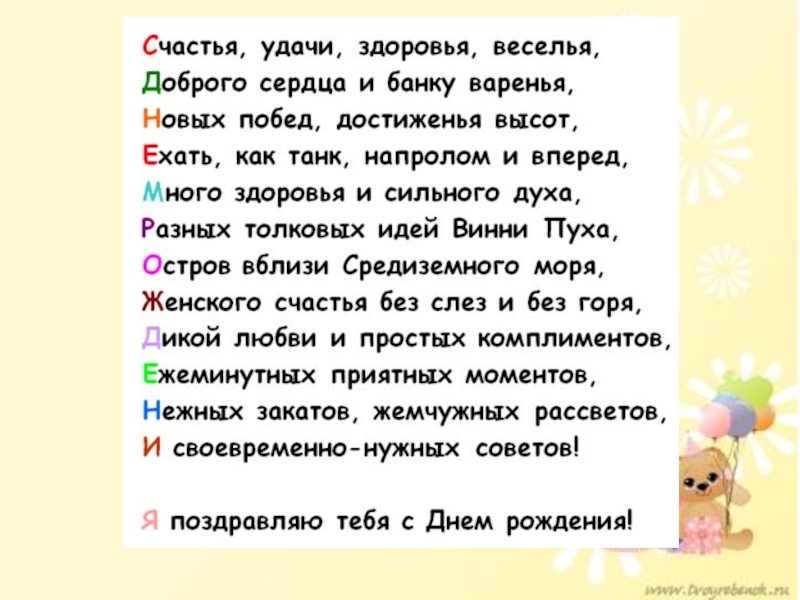 встречать обид, ненастий, Пусть все дни успех наполнит, Жизнь желания исполнит. Радость пусть сияет в сердце, Даст любовь душе согреться, А улыбка и веселье «Сторожат» пусть настроенье!
