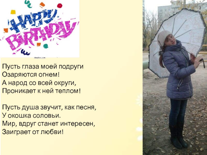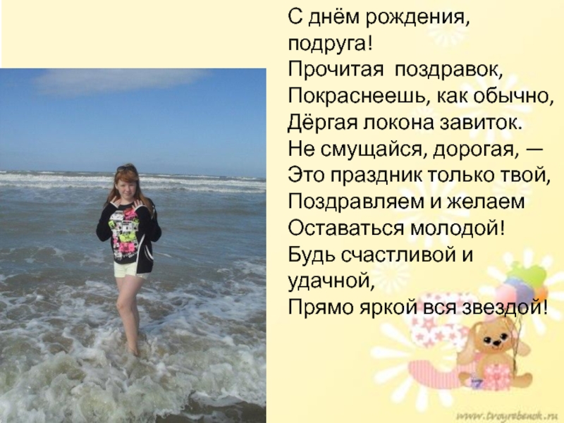 Слайд 3С днём рождения, подруга! Прочитая поздравок, Покраснеешь, как обычно, Дёргая локона завиток. Не смущайся,