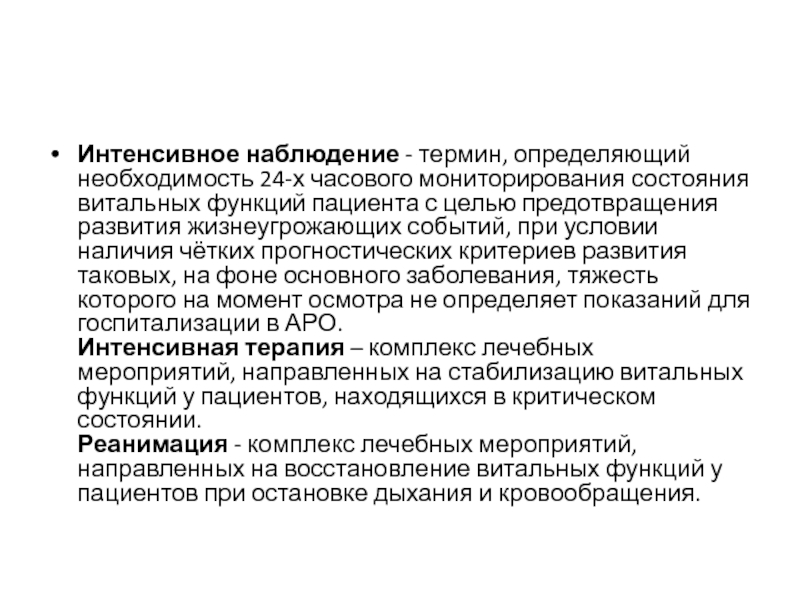 Слайд 24Интенсивное наблюдение - термин, определяющий необходимость 24-х часового мониторирования состояния витальных