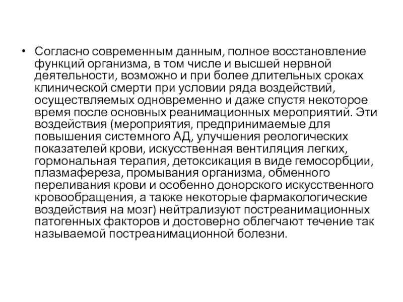 клинической смерти при условии ряда воздействий, осуществляемых одновременно и даже спустя некоторое время после основных реанимационных мероприятий. Эти воздействия (мероприятия, предпринимаемые для повышения системного АД, улучшения реологических показателей крови, искусственная вентиляция легких, гормональная терапия, детоксикация в виде гемосорбции, плазмафереза, промывания организма, обменного переливания крови и особенно донорского искусственного кровообращения, а также некоторые фармакологические воздействия на мозг) нейтрализуют постреанимационных патогенных факторов и достоверно облегчают течение так называемой постреанимационной болезни.