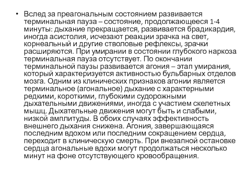 зрачка на свет, корнеальный и другие стволовые рефлексы, зрачки расширяются. При умирании в состоянии глубокого наркоза терминальная пауза отсутствует. По окончании терминальной паузы развивается агония – этап умирания, который характеризуется активностью бульбарных отделов мозга. Одним из клинических признаков агонии является терминальное (агональное) дыхание с характерными редкими, короткими, глубокими судорожными дыхательными движениями, иногда с участием скелетных мышц. Дыхательные движения могут быть и слабыми, низкой амплитуды. В обоих случаях эффективность внешнего дыхания снижена. Агония, завершающаяся последним вдохом или последним сокращением сердца, переходит в клиническую смерть. При внезапной остановке сердца агональные вдохи могут продолжаться несколько минут на фоне отсутствующего кровообращения.