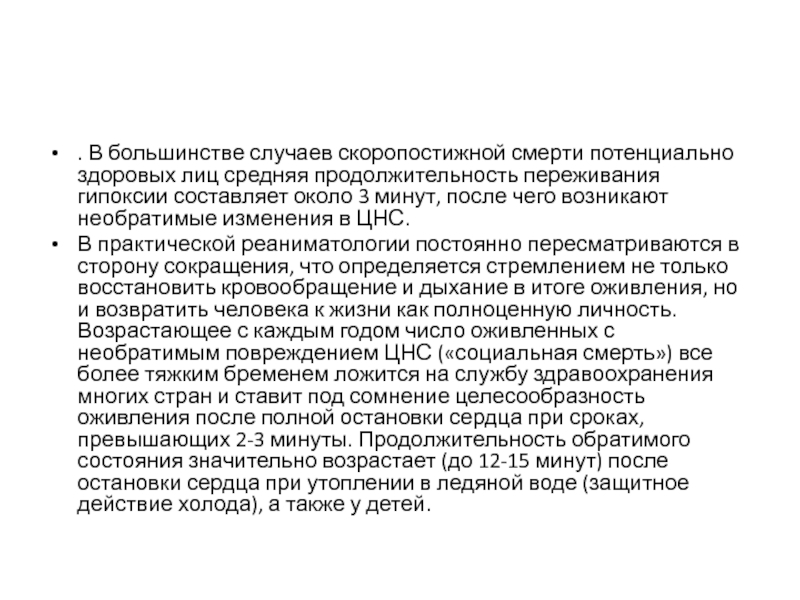 В практической реаниматологии постоянно пересматриваются в сторону сокращения, что определяется стремлением не только восстановить кровообращение и дыхание в итоге оживления, но и возвратить человека к жизни как полноценную личность. Возрастающее с каждым годом число оживленных с необратимым повреждением ЦНС («социальная смерть») все более тяжким бременем ложится на службу здравоохранения многих стран и ставит под сомнение целесообразность оживления после полной остановки сердца при сроках, превышающих 2-3 минуты. Продолжительность обратимого состояния значительно возрастает (до 12-15 минут) после остановки сердца при утоплении в ледяной воде (защитное действие холода), а также у детей.