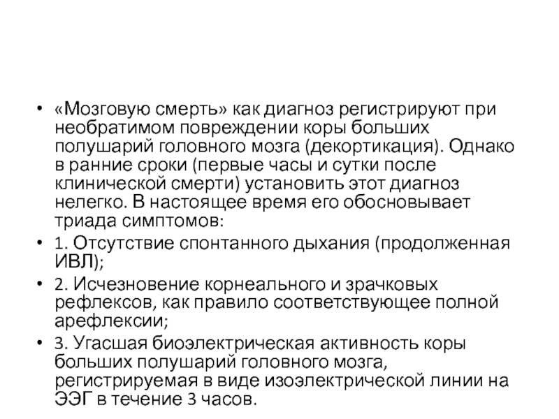 и сутки после клинической смерти) установить этот диагноз нелегко. В настоящее время его обосновывает триада симптомов: